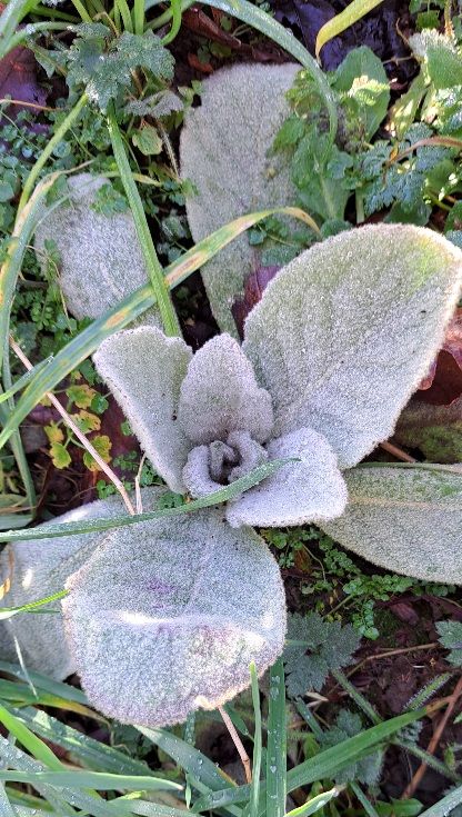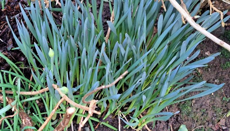 Daffodils, and a young self-seeded mullein plant.