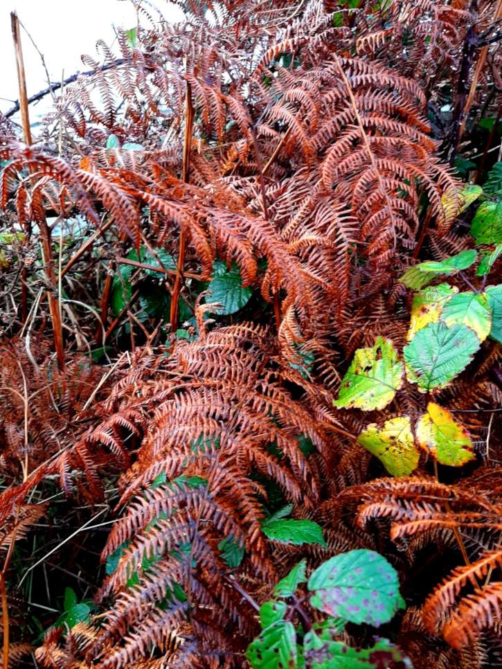 The colour palette of browns is very attractive, browns like sienna, russet, or burnt umber are surely seen in this autumn landscape, and during the winter the shades might be darker, like deep coffee brown which is a rich, dark shade. These ferns (Pteridium aquilinum) but called bracken around here, are a very wide spread fern in Ireland, they grow all over the hills and tree-lined roadsides, they even came growing in our garden. I think that it is the damp weather that makes them thrive so well. They are beautiful especially when their leaves unfurl, or like this in the autumn season.