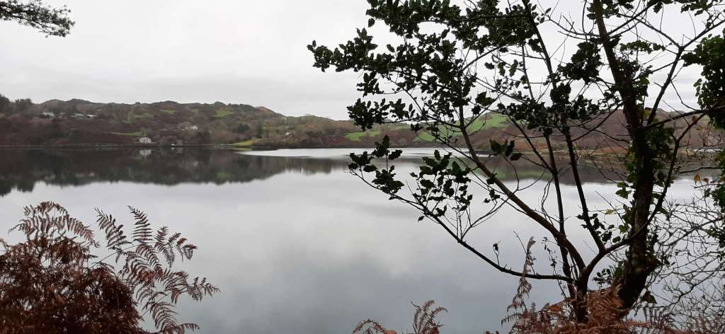 The light at the forested area around Loch Ine was subdued and the sun was missing from this lovely scene but that did not take away from the beauty of our walk. Across the lake we saw the early morning swimmers, a group of women who swim there right through the winter. I did not touch up my photos, the colour of the water here in this photo is really how we saw it, how it was. And it was beautiful and special, I think that it was a trick of the light.