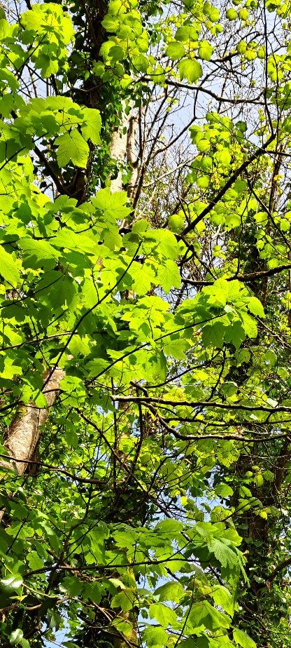 I met by chance a friend of mine walking her little dog, and it was lovely catching up with her. After a while I started on my walk up the hill as I wanted to check the wild plants and the trees. It was an ideal day for it, the sun showed the bright yellow green of the emerging sycamore leaves beautifully, while underground there was a multitude of interesting wild plants and flowers.